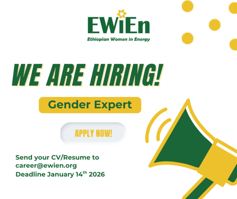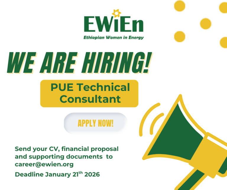 We are Hiring! We are Hiring! Ethiopian Women in Energy (EWiEn) is seeking an Individual Consultant to conduct the review and validation of technical specifications for Productive Use of Energy (PUE) equipment under the EWAS project.If you are a seasoned…